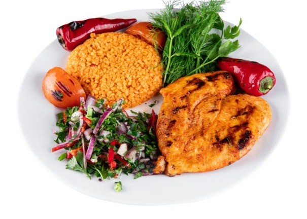 grillowana mielona wołowina, zawinięta w lawasz, kasza, warzywa, jogurt