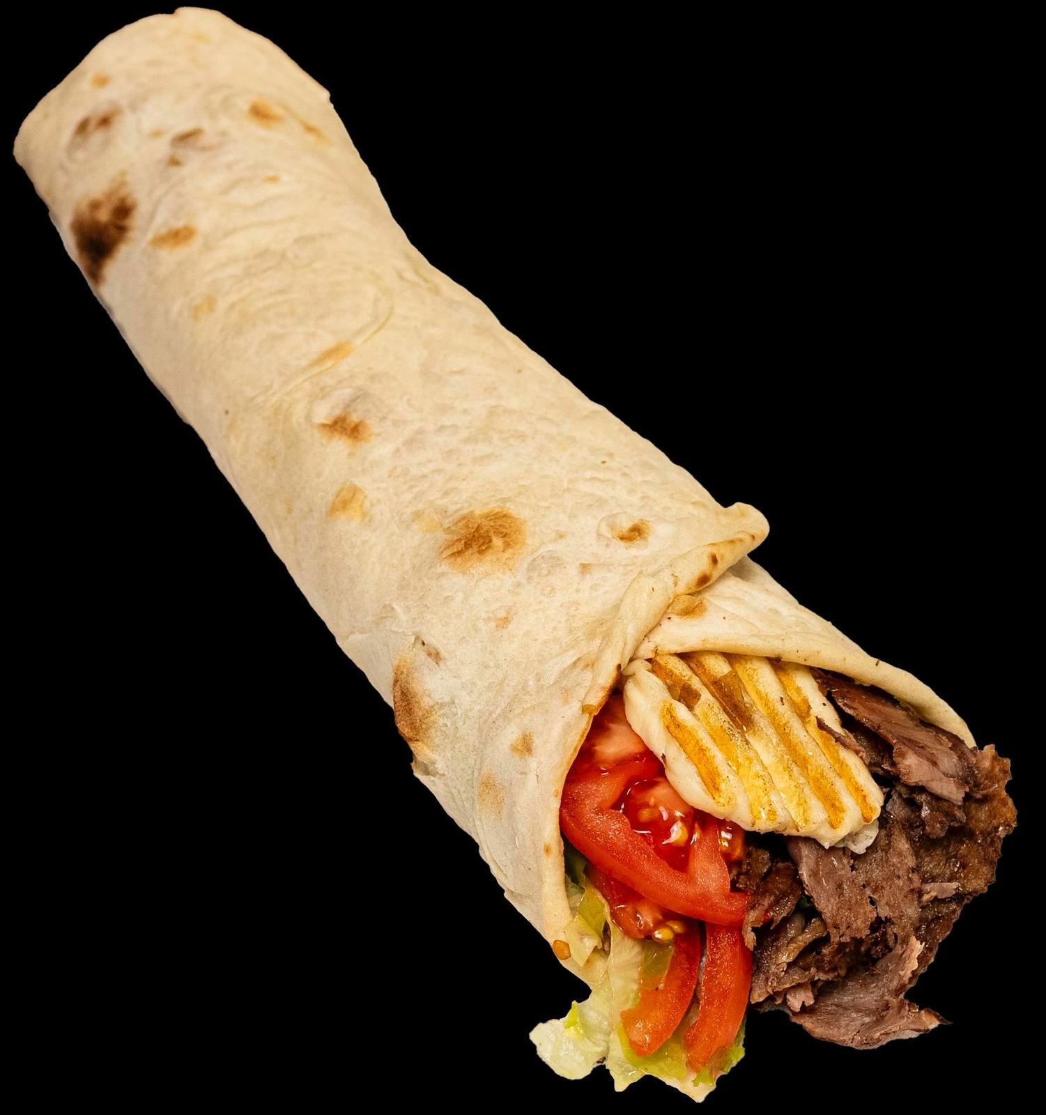 pieczone mięso, lawasz, ser halloumi, surówka, sos