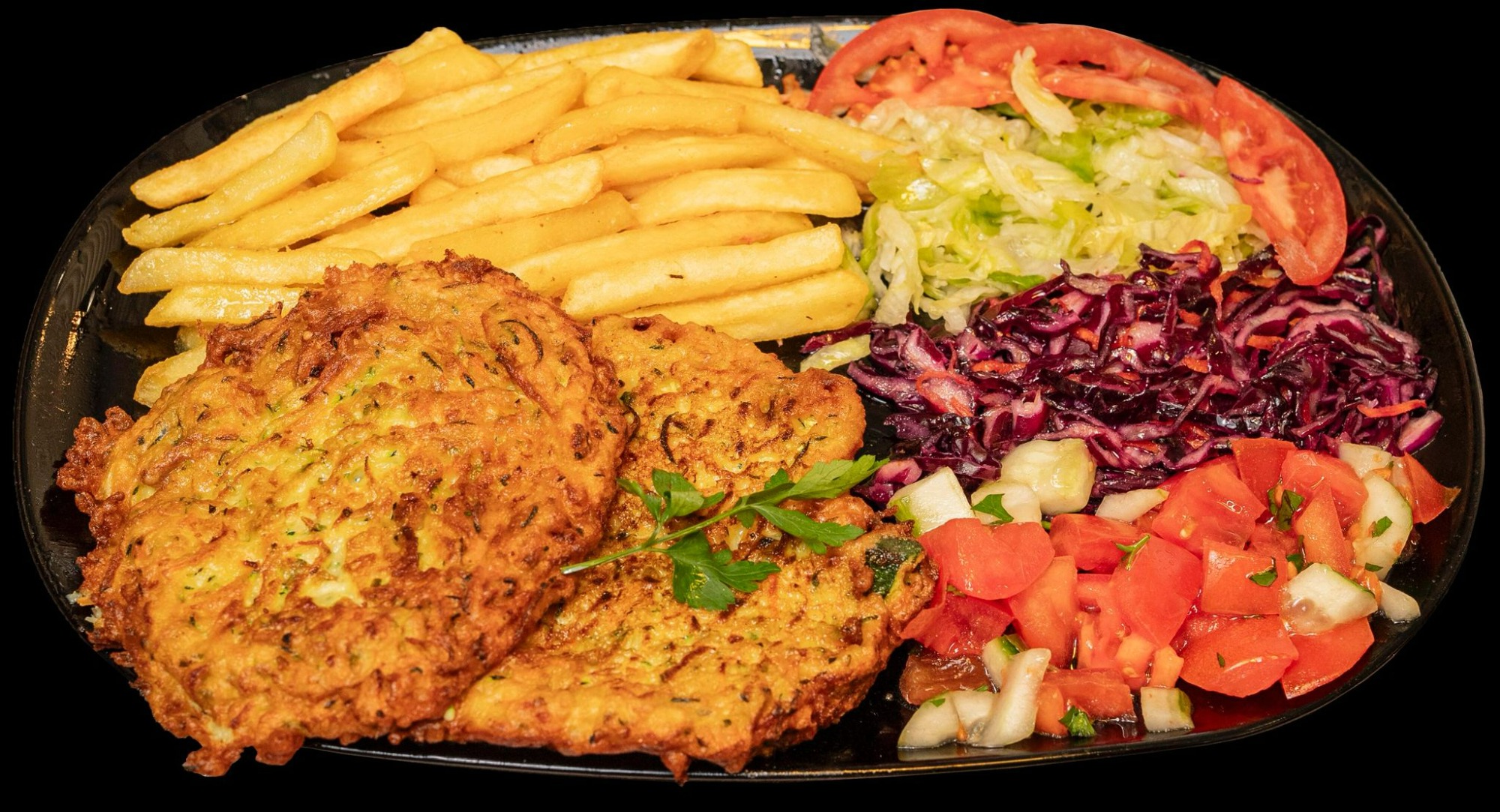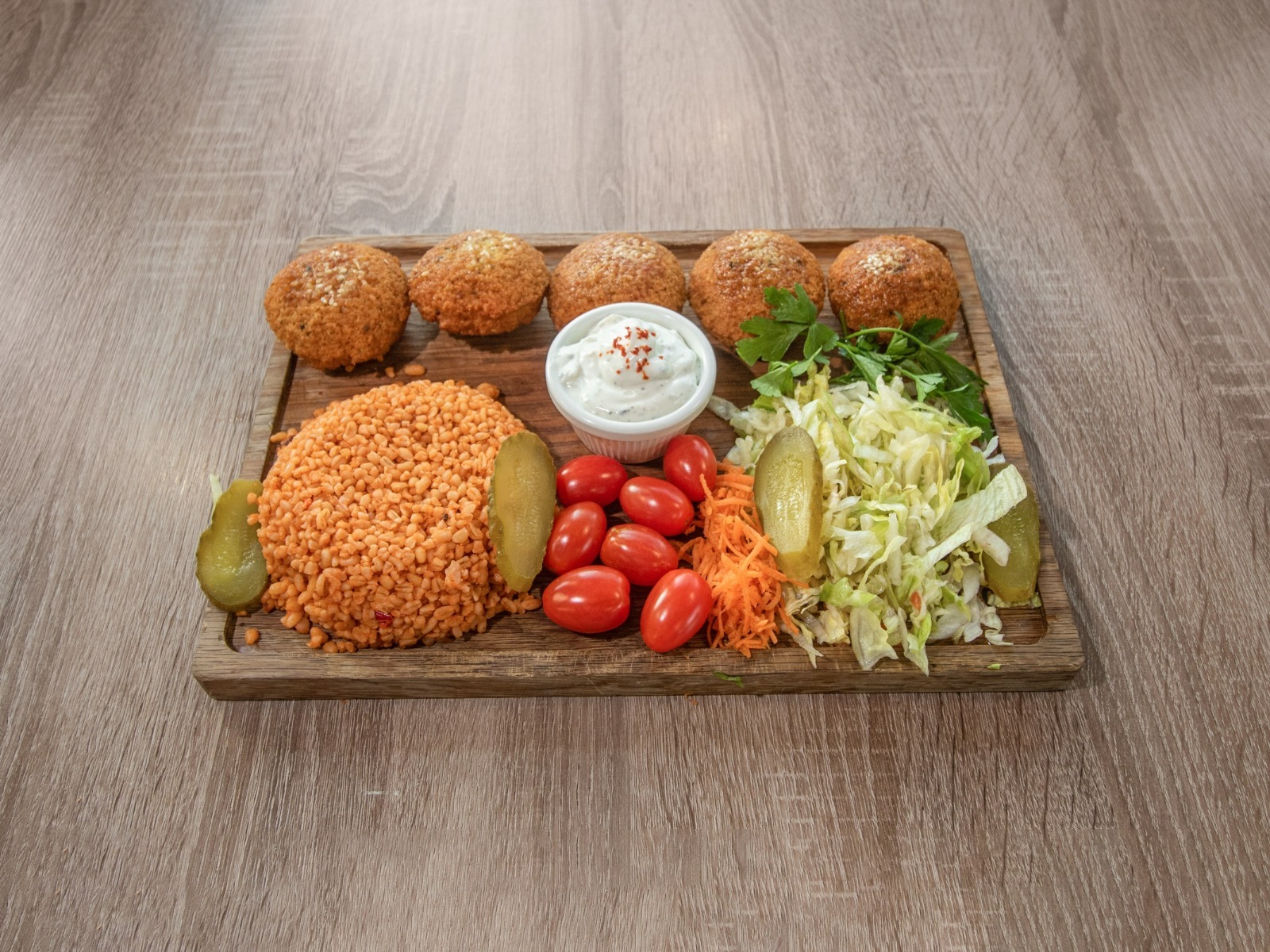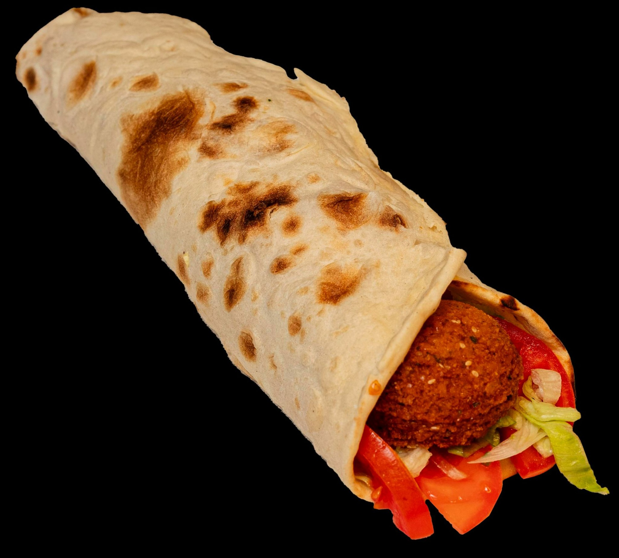 smażony falafel, pita, ser żółty lub hummus, surówka, sos